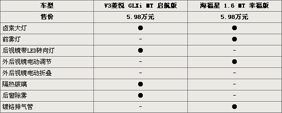 從外觀來(lái)看,兩款車有較大的區(qū)別,菱悅并沒(méi)有配備前霧燈,外后視鏡集合了LED轉(zhuǎn)向燈,但外后視鏡不可以電動(dòng)調(diào)節(jié)和折疊。而海福星則沒(méi)有隔熱玻璃和后窗除霧功能,兩款車的配備各有不足。