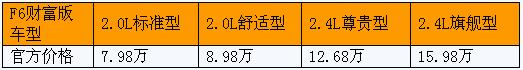 F6財(cái)富版的上市取消了豪華型, 標(biāo)準(zhǔn)型7.98萬(wàn)將價(jià)格直接下探至7萬(wàn)區(qū)間;增配后的舒適型價(jià)格也維持8.98萬(wàn)不變。"比亞迪每年都保持100%的增長(zhǎng)速度, 08年20萬(wàn)輛的銷售目標(biāo)完成比較輕松, 09年的比亞迪年度銷售目標(biāo)是40萬(wàn)輛。" 比亞迪汽車銷售公司總經(jīng)理夏治冰非常自信的說(shuō)到。而事實(shí)上,受上半年良好的業(yè)績(jī)支撐,以及巴菲特入股后,比亞迪08年已經(jīng)實(shí)現(xiàn)了品牌和銷量的雙豐收。在下半年無(wú)太多銷量壓力的情況下,比亞迪卻率先推出F6財(cái)富版,明顯的這是凱凱超值定律的延續(xù),著手打造最超值的中級(jí)車。