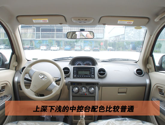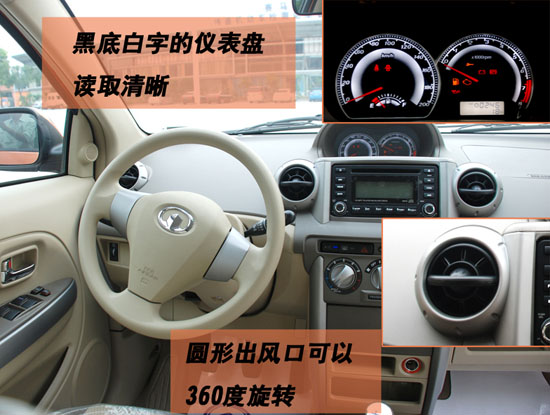 長城炫麗的內(nèi)飾風格走的是樸素實用的路線,符合小型家用車的市場定位。上深下淺的中控臺配色很傳統(tǒng),中置儀表盤上的兩個表盤很像兩只大眼睛,四個圓形的空調(diào)出風口和中控臺上其他的方方正正的模塊造型不太搭調(diào),而且出風口的面積也稍微有點小,不過好在可以360°旋轉(zhuǎn)以方便用戶調(diào)節(jié)。