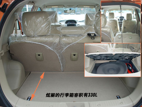 炫麗作為一款家用小型車,其空間表現(xiàn)也比較一般。2368mm的軸距很難給后排腿部空間多大的支持,在前排座椅調(diào)節(jié)到比較舒服的位置后,后排的腿部就比較緊張了。后備箱空間受軸距的限制,不過仍有330L的容積,好在炫麗后排座椅靠背可以4/6折疊,全部放倒后后備箱空間能夠達到1038L,家里要是拉些東西的話將將夠用。
