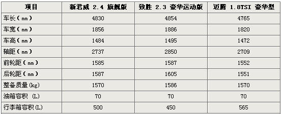 在車身尺寸方面,雖然致勝以4854mm的車長、1886mm的車寬、1495mm的車高以及2850的軸距位居三款車之首,而新君威以37mm的軸距優(yōu)勢領先于邁騰。由于整車軸距決定了車內空間,所以致勝的內部空間較其它兩款車更加寬裕。雖然邁騰在車身尺寸方面不占優(yōu)勢,但其565L的行李箱容積卻分別高出新君威及致勝65L和115L。