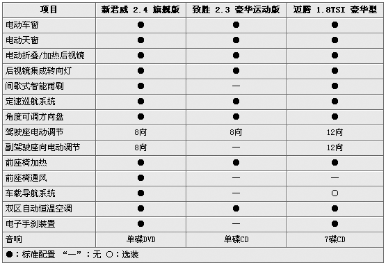 在豪華配置方面,三款個性中級車更是不遺余力的配備各自高端配置,電動天窗、定速巡航、電動座椅、座椅電加熱以及分區(qū)自動空調均稱為三款車的標準配置。但新君威配備了的通風座椅,卻沒有出現(xiàn)在致勝與邁騰車型上。此外,新君威與邁騰配備的電子手剎裝置,似乎要比致勝的傳統(tǒng)拉線式手剎更加時尚。