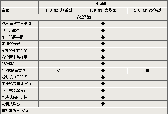 在安全配置方面,海馬3(參數(shù)配置 圖庫)兩廂車型全系標配ABS+EBD和雙安全氣囊,保證乘員的安全。而特別設(shè)計全車門防撞夾銷也保證了碰撞后的車門結(jié)構(gòu)性。全系標配的車速感應自動落鎖及碰撞自動開鎖功能也在同級車中較為少見。應該是出于成本的考慮,入門級的舒適型沒有配置倒車雷達這一實用的配置,對于新手來說多有不便。