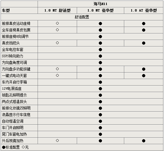 在舒適配置方面,海馬H11具備很多人性化配置,如自動恒溫空調(diào)、全車運動式座椅,電動升降四門玻璃,遮陽板化妝鏡雙照明等等。而高配車型的座椅,方向盤以及擋把和手剎拉桿,均由真皮包裹,加上一鍵式天窗和方向盤上的音響控制按鍵,令駕駛與享受可以兼得。其它如鑰匙孔照明提示,行車信息液晶顯示等,均提升了海馬3兩廂版的整車品質(zhì)。