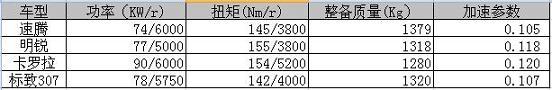 下表中是4款車型的動(dòng)力參數(shù)、整備質(zhì)量(空車重量)和加速參數(shù)。其中加速參數(shù)是用扭矩/整備質(zhì)量得到的一個(gè)參考值。近似于牛頓第二定律(a=F/m),該參數(shù)僅作為加速能力的參考,可以說這個(gè)數(shù)值越大加速性越好。