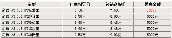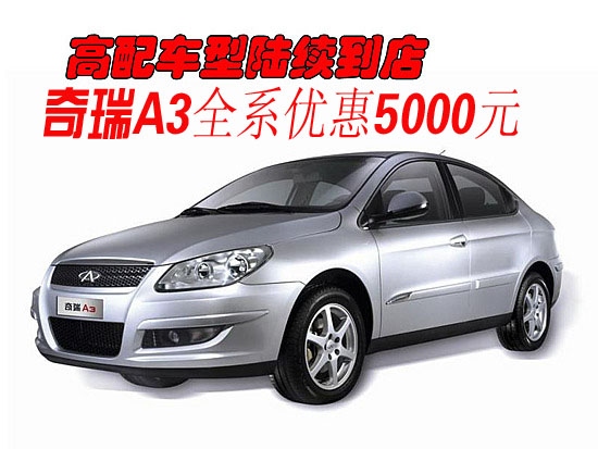 奇瑞A3(參數(shù)配置 圖庫(kù))是一款B00級(jí)的家用轎車,并通過配備ESP等配置擁有較高的性價(jià)比,自上市起就受到消費(fèi)者的關(guān)注。而針對(duì)前一段時(shí)間所售A3僅提供低配車型的情況,近日編輯通過經(jīng)銷商了解到,1.8L的高配車型已經(jīng)陸續(xù)到店,而現(xiàn)在購(gòu)買可享受到全系5000元的現(xiàn)金優(yōu)惠。具體詳情如下: