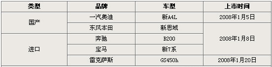 隨著時(shí)間的流逝,如火如荼的2008年中國(guó)車市已成為過去,2009新的一年已經(jīng)向我們走來。但由于去年下半年全球金融危機(jī)的爆發(fā),汽車行業(yè)也遭遇了重重變數(shù),從而導(dǎo)致市場(chǎng)需求略顯疲軟,這一點(diǎn)從09年1月即將上市新車數(shù)目就可以看出。據(jù)記者統(tǒng)計(jì)09年一月份各大汽車廠商僅有5款車型推出,其中國(guó)產(chǎn)新車2款,進(jìn)口新車3款。下面不妨讓我們提前來看一看在09年一月份這段時(shí)間里將要上市的車型吧。
