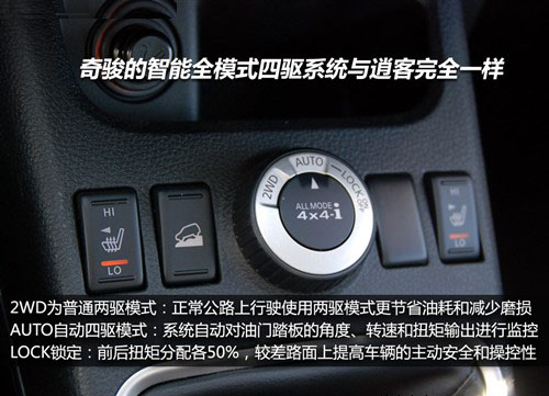 奇駿采用的是和逍客一樣的電控多片式離合器,正常行駛情況下,動力100%輸出到前軸,而在自動模式下,行車電腦檢測到前輪打滑時,會自動將50%的動力分配到后輪。使用擋把后面的驅(qū)動模式轉(zhuǎn)換旋鈕,也可以進行四驅(qū)鎖止,在起步階段就將50%的動力分配給后輪,但是在時速超過40km/h之后,會自動切換回兩驅(qū)模式,以節(jié)省燃油。
