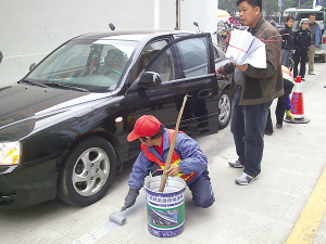 取締非法泊位的工作就是用白色油漆涂在原來(lái)的白色線框上,隨即用水泥粉撒在上面。工人們說(shuō),等油漆干了,水泥粉就會(huì)粘在上面,使線條顏色與地面顏色接近,達(dá)到清除的效果。