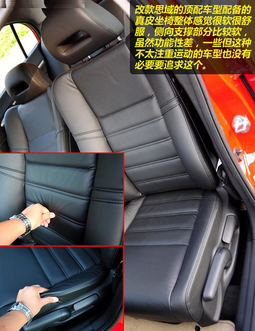 黑色的真皮坐椅裝配在高配的新思域車內(nèi)顯得比較得體,雖帶有側(cè)向支撐,但由于支撐部分的海綿比較軟,所以實(shí)際效果并不理想。不過誰會計(jì)較思域這么一個本就不算運(yùn)動型車的座椅夠不夠運(yùn)動呢?樣式好看,坐著舒服就足夠了。