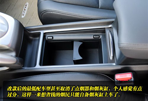 綠色玻璃、前排中央扶手的取消也勉強(qiáng)可以說的過去,最讓人不能理解的就是在新思域的最低配車型中竟然連點(diǎn)煙器和煙灰缸都取消了!難道說這款最便宜的思域是不準(zhǔn)備賣給希望在自己的車?yán)锬艹楦鶡煹南M(fèi)者的?就算是要減少成本,一個點(diǎn)煙器和一樣可移動的煙灰缸能增加多少成本呢?雖然說這些東西消費(fèi)者是可以在買了車以后自行配齊,但原廠不帶這兩樣?xùn)|西,總會讓人感覺很別扭,編輯認(rèn)為廠家完全沒有必要做的這么徹底,基本滿足用戶的駕駛需求是廠家對最低配車型的市場定位,減掉這兩樣小東西是還可以滿足不抽煙或者不在車內(nèi)扔小垃圾的用戶的需求,但同時也讓另一部分抽煙的消費(fèi)者感覺到不舒服了。