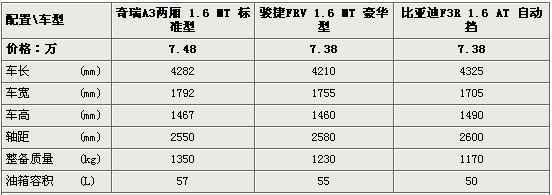 從三款車型的尺寸對比來看,奇瑞A3兩廂的個頭比較大,無論是車長還是車寬,不過在影響內部空間的車高和軸距方面,F3R更勝一籌。不過三款車型的外形有著很大的不同,如何選擇還要看您自己的喜好。