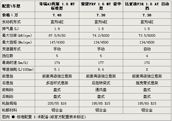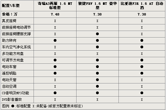 1月6日,備受關注的奇瑞A3兩廂版車型正式上市,此次上市的奇瑞A3兩廂 1.6L兩款車型售價為7.48萬元和8.48萬元,1.8L兩款車型售價為8.28萬元和9.08萬元,共有6種顏色(奇瑞白、狼堡灰、納斯達克銀、激情紅、愛琴海藍和碧璽金)。而對于消費者來說無疑在選擇兩廂車時又多了一個新選擇,下面我們選擇了來自華晨和比亞迪的兩款兩廂車FRV、F3R,來看看A3兩廂的配置如何,它們的價格非常的接近,希望能對您購車有所幫助。