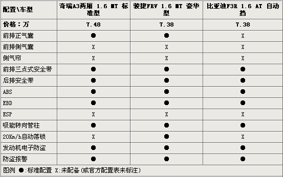 在舒適配置方面,三款車都采用的是普通絨布座椅,手動調節(jié)前后,駿捷FRV配置了腰部條件,為駕駛者提供更舒適的駕駛感受。電動車窗、可調方向盤、CD音響等裝備都為標配,同時駿捷FRV還裝備電動天窗、自動空調兩廂高檔配置,而奇瑞A3的配置要相對低一些。
