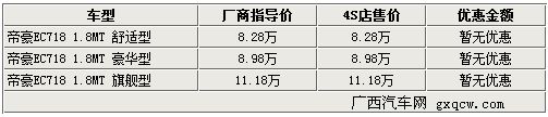據(jù)帝豪4S店銷售人員介紹,帝豪EC718共有三款車型,售價8.28萬元起。目前店內(nèi)車型顏色不是很全,消費(fèi)者可以到店看車、購買;暫時沒有的顏色可預(yù)訂,訂金3000元,預(yù)計交車時間大概在一個月左右。全系車型因是新車,所以暫時沒有現(xiàn)金優(yōu)惠或贈品,還請消費(fèi)者諒解。