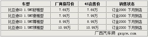 10月26日,比亞迪汽車首款中級(jí)車G3正式在國(guó)內(nèi)上市,售價(jià)7.69-10.99萬(wàn)元。比亞迪G3是比亞迪汽車A3銷售網(wǎng)絡(luò)和G系產(chǎn)品的首款車型,標(biāo)志著比亞迪汽車開(kāi)啟了全新的產(chǎn)品時(shí)代,走向高端化發(fā)展路線。本站了解到,目前比亞迪各家經(jīng)銷商處還沒(méi)有G3現(xiàn)車銷售,僅提供預(yù)訂,訂金2000元,最快將在下個(gè)月到店。詳情如下: