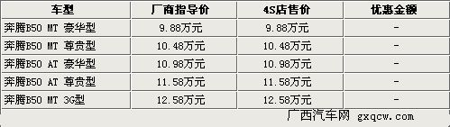 據(jù)一汽奔騰4S店銷售人員介紹,奔騰B50目前的銷售情況非常好,但現(xiàn)在所有車型顏色均不是很全,部分顏色仍需要預(yù)訂。消費(fèi)者如果預(yù)訂奔騰B50,需要交付1000元訂金,而且B50自上市起到現(xiàn)在一直沒(méi)有任何優(yōu)惠活動(dòng)。而3G版車型則一直處于無(wú)車的狀態(tài),還請(qǐng)消費(fèi)者諒解。