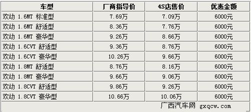 銷售人員表示,現(xiàn)在店內(nèi)的歡動(dòng)車型較齊全,全系車型均可享受6000元的現(xiàn)金優(yōu)惠,同時(shí)還有1000元至2000元的大禮包贈(zèng)送,同樣超值,但不可折換現(xiàn)金。