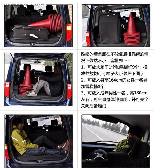 可能從寬度和進(jìn)深上看不大出來它能達(dá)到如此令人吃驚的程度,但是由于酷熊有較高的車身,所以空間的利用率是很高的。后排座椅靠背放倒后尚有一點(diǎn)傾斜的角度,但與后備廂地板連接處沒有臺階,是純平的。