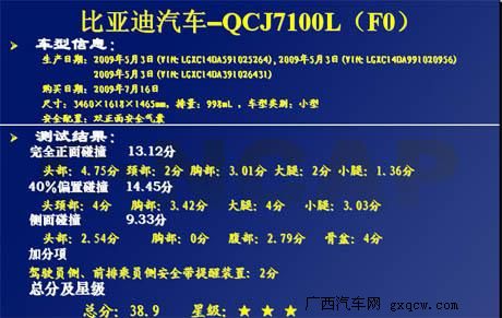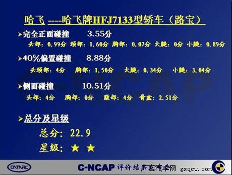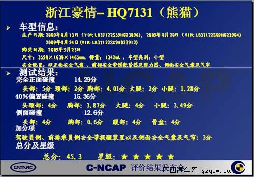 自主小車是不是就意味著不安全?低價(jià)是不是就意味著低質(zhì)?碰撞的結(jié)果中可以看到,有三款車型獲得了三星以上的碰撞成績,這其中,長城精靈、比亞迪F0分別獲得了三星的成績,吉利熊貓獲得了五星的碰撞成績。由于個(gè)頭小、吸能空間有限等“先天劣勢(shì)”,在C-NCAP碰撞試驗(yàn)中成績大多并不理想,撞得三星已屬不易。尤其值得值得注意的是,在這六款車中,吉利熊貓以45.3分的成績成為首款獲得五星安全的A00級(jí)小車。國家轎車質(zhì)量監(jiān)督檢驗(yàn)中心在評(píng)價(jià)報(bào)告中指出,這標(biāo)志著自主品牌小型車被動(dòng)安全技術(shù)已經(jīng)與國際接軌。應(yīng)該說,對(duì)于在價(jià)格上處于低位的自主品牌小型車來說,這樣的碰撞成績是可以讓消費(fèi)者放心的。