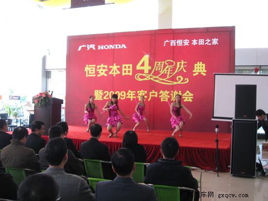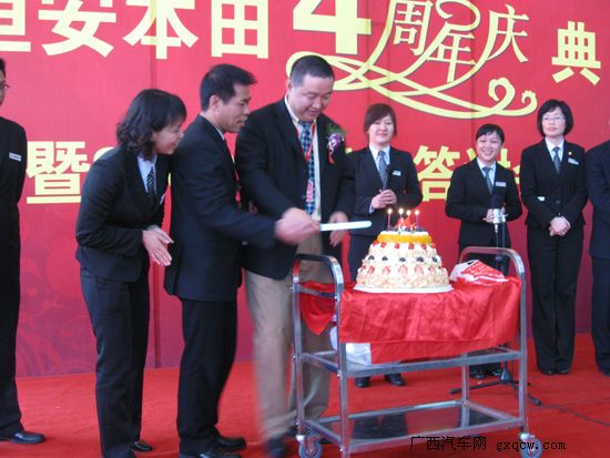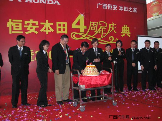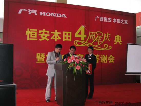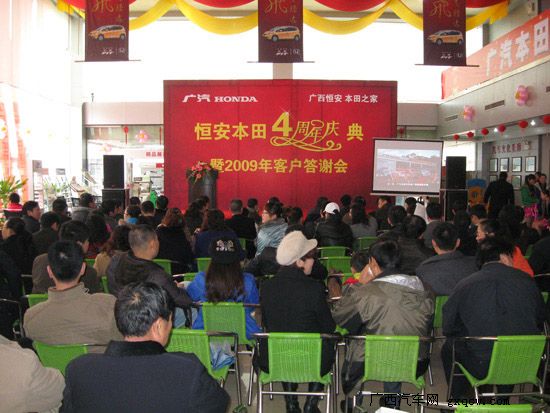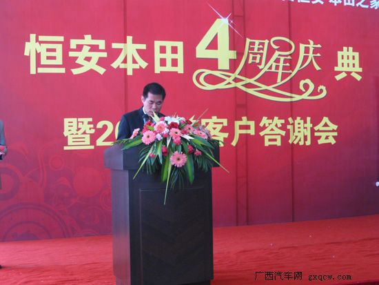 剛剛走過(guò)充滿挑戰(zhàn)的2009年,迎來(lái)恒安本田四周年的大好日子。儀式上公司總經(jīng)理梁平為慶典致辭,簡(jiǎn)明扼要而又點(diǎn)線帶面地向公司領(lǐng)導(dǎo)和嘉賓介紹了恒安本田一年來(lái)所取得的矚目成績(jī)。恒安本田車友會(huì)組織——恒友會(huì),已經(jīng)成為全區(qū)最大的廣汽本田車友組織,一年來(lái),舉辦的各種各樣、內(nèi)容豐富的活動(dòng)受到眾多車友的好評(píng)。對(duì)于廣大客戶的厚愛(ài)與支持,表示最衷心的謝意。梁總還對(duì)過(guò)去一年勤勤懇懇、兢兢業(yè)業(yè)的全體員工表示誠(chéng)摯的感謝,并希望和鼓勵(lì)大家在新的一年里,清醒的認(rèn)識(shí)我們成長(zhǎng)過(guò)程中所遇到的困難,正視我們與先進(jìn)的同行之間存在的差距,打造業(yè)績(jī),精細(xì)流程,重視客戶滿意度,齊心協(xié)力攜手向保持在廣西區(qū)域同品牌領(lǐng)先位置的目標(biāo)而闊步邁進(jìn)!