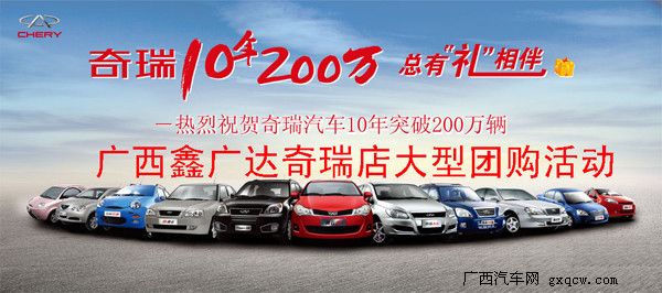 虎年新春賀歲!“奇瑞10年200萬,總有禮相伴”春季促銷活動,叩響2010的開門紅!值此佳節(jié),鑫廣達奇瑞4S店開展大型團購活動,優(yōu)惠多多等你來拿!