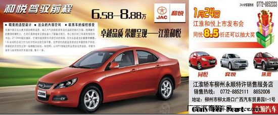 江淮自從上市以來一直都是大家的關(guān)注焦點,特別是在去年江淮銷售更加是一路飆升,獲得了銷售的好成績,為了感謝廣大客戶對我們柳州永順店的關(guān)注與支持 本店在新年之際為酬謝廣大客戶 決定在2010年(1月30日早上9:30)舉辦“江淮和悅、同悅AMT柳州上市新聞發(fā)布會”到店客戶均有機會贏取8.5折同悅 .