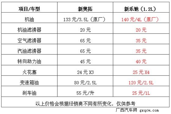 在車(chē)輛的使用過(guò)程當(dāng)中,除了油耗費(fèi)用,必須涉及到的就是定期維護(hù)費(fèi)用,下面是我們根據(jù)北京地區(qū)4S店提供的價(jià)格,統(tǒng)計(jì)出來(lái)的兩款車(chē)的耗損零件價(jià)格: