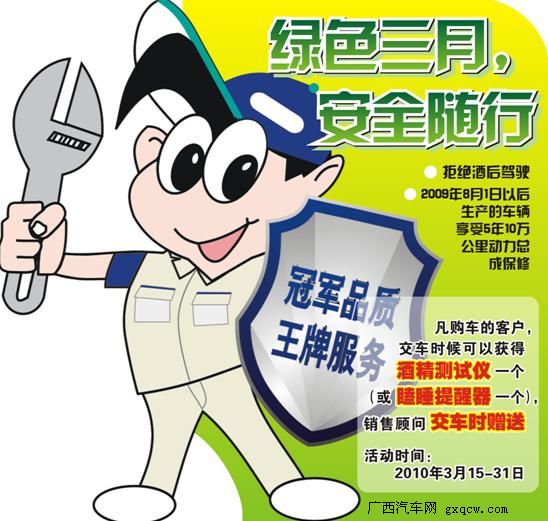 三月是一個充滿生機和綠色的季節(jié),為了保障客戶行車安全,提倡安全行車、綠色用車的概念,杜絕酒后駕駛,鑫廣達北京現(xiàn)代4S店3月15-31日將在店內(nèi)開展主題為“綠色三月,安全隨行”的活動,活動期間購車的客戶均可獲得酒精測試儀一個(或者瞌睡提醒器一個),由銷售顧問交車時贈送。