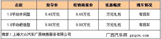 桑塔納志俊價格實在,動力表現(xiàn)不錯,自上市以來就受到不少消費者的喜愛。近日,小編走訪南寧車市時,在上海大眾汽車廣西銷售服務(wù)有限公司處了解到,目前桑塔納志俊有少量現(xiàn)車,現(xiàn)在購車可獲贈萬元禮包。具體行情如下:
