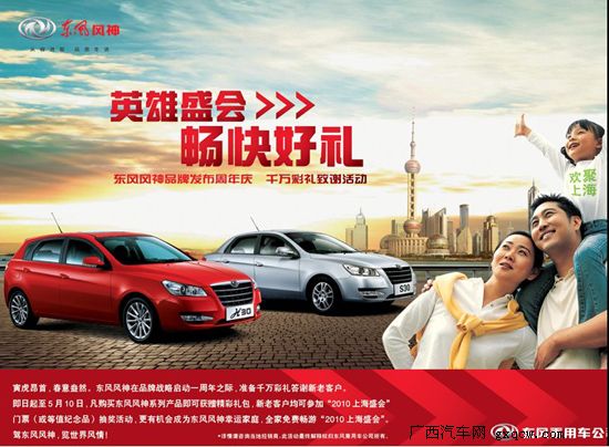 據(jù)了解,即日起至5月10日活動期間,凡在當(dāng)?shù)貣|風(fēng)風(fēng)神專營店或其二級銷售服務(wù)網(wǎng)點(diǎn)購買風(fēng)神S30、風(fēng)神H30車系任一款車的新老客戶,均有機(jī)會參加在上海舉行的舉世矚目的全球盛會門票(或等值紀(jì)念品)抽獎活動,另將在公證部門監(jiān)督下抽出10個(gè)幸運(yùn)家庭免費(fèi)參加"東風(fēng)風(fēng)神家庭上海盛會旅游團(tuán)",親臨全球盛會現(xiàn)場加油助威。