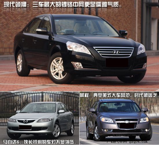 這三款車(chē)都是市場(chǎng)上的老面孔了,論銷(xiāo)量在公路上的能見(jiàn)度也著實(shí)不少,所以我們也就不在外觀(guān)上多費(fèi)筆墨。首先外形上馬自達(dá)6最運(yùn)動(dòng),全身緊繃的肌肉以及狹長(zhǎng)銳利的車(chē)燈即使放在今天也絲毫不顯落伍;雪佛蘭景程則是典型的美式大車(chē)風(fēng)范,舒展大氣的線(xiàn)條及盾型中網(wǎng)氣勢(shì)是有了,但是時(shí)代感有所欠缺;作為三車(chē)中生產(chǎn)年代最新的領(lǐng)翔,走的是儒雅大氣路線(xiàn),大面積鍍鉻中網(wǎng)與四平八穩(wěn)的造型也能滿(mǎn)足多數(shù)中國(guó)人的面子問(wèn)題。