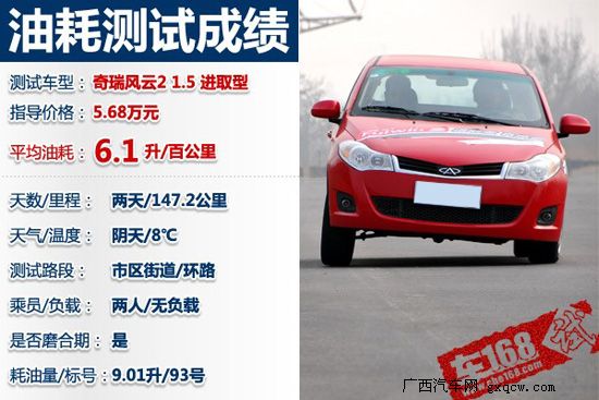 百公里綜合油耗:6.1升 由于奇瑞風(fēng)云2是一款主打家用的三廂轎車,因而我們在對其進行綜合油耗測試時,模擬了一條日常行駛路線。其中包括市區(qū)環(huán)路、高速(環(huán)路連接線)、市區(qū)街道(包括擁堵路段)以及考慮到各人駕駛習(xí)慣不同的原因,特意進行了一段短暫的激烈駕駛。最終,我們測得奇瑞風(fēng)云2的百公里綜合油耗為:6.1升。 奇瑞風(fēng)云2在工信部給出的燃油消耗標(biāo)簽上綜合油耗為6.9升,比我們實際測得的數(shù)值高了0.8升,看來這臺1.5升發(fā)動機的日常經(jīng)濟性表現(xiàn)還是值得肯定的。 編輯點評:時尚的外觀、便利的功能設(shè)計、相對較低的價格、良好的駕乘舒適性以及較高的燃油經(jīng)濟性,這些作為一款實用型家庭轎車的必備因素,可以說在奇瑞風(fēng)云2身上都能找到。其全系車型5.28-6.18萬元的價格區(qū)間以及不到7升百公里綜合油耗,對于一般工薪階層的消費者來說,的確是個不錯的選擇。