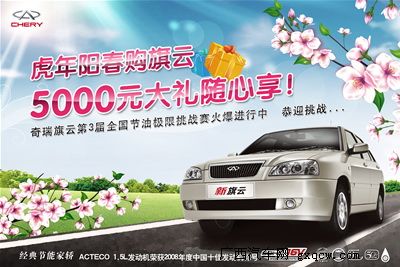 “外觀大氣、動力充足、超低油耗、低維護(hù)成本”,只要想得到,旗云都讓你享受到!白钍且荒甏汉锰帯,奇瑞旗云春季促銷活動,對于客戶來講可謂出手正當(dāng)時,相信5000大禮會讓您驚喜不斷,好事連連。據(jù)悉,奇瑞旗云第三屆節(jié)油挑戰(zhàn)賽將在2010年3月中旬在西安正式啟動,同時海選也在全國范圍內(nèi)展開,有興趣的朋友可以到經(jīng)銷商處報名,親身體驗旗云的超強經(jīng)濟(jì)性能。