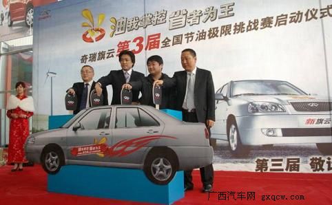 2010年3月18日,萬眾矚目的奇瑞旗云第3屆全國節(jié)油極限挑戰(zhàn)賽正式上演,大賽啟動儀式在西安舉行,盛況空前。同時配合開幕的節(jié)油友誼挑戰(zhàn)賽同期舉行,掀起一股節(jié)油熱潮,為賽事預熱。根據(jù)賽程,第一階段的海選賽事也于今日在全國范圍內(nèi)正式拉開帷幕。