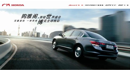 2: 2010年4月1日-5月7日購買廣汽本田雅閣(Accord)的客戶,即可參加“購雅閣,看世博,廣汽本田200萬銷量贈厚禮”活動,有機(jī)會贏取雙人世博之旅,帶您一起博覽全球精彩;
