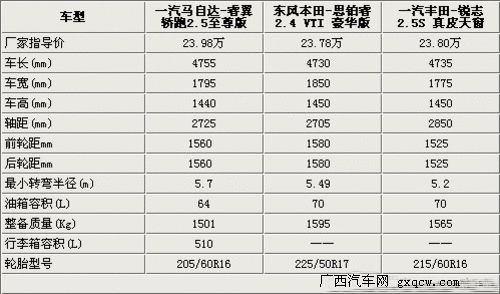 我們選取的三款車型都是位于該車系中黃金排量,售價都在24萬元左右。在車身尺寸方面睿翼轎跑是三款車型中最長的,同時睿翼轎跑又是唯一一款采用兩廂半的設(shè)計(jì)車型,這使得睿翼轎跑看起來動感十足。豐田銳志的軸距達(dá)到了2850是3款車型中最長的,保證了銳志內(nèi)部空間的寬敞。思鉑睿的前后輪距都要大于睿翼轎跑和銳志,達(dá)到了1580mm。同時在輪胎寬尺寸上也是最大的,這意味著思鉑睿的操控性能將要優(yōu)越于另外兩款車型。睿翼轎跑、思鉑睿和銳志的轉(zhuǎn)彎半徑都在5米左右。思鉑睿和銳志兩款車型的油箱都是70升,足以應(yīng)付一般家庭的正常使用,睿翼轎跑則要小點(diǎn),容積為64升。