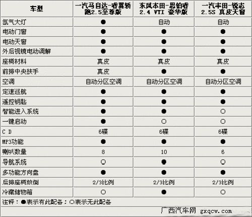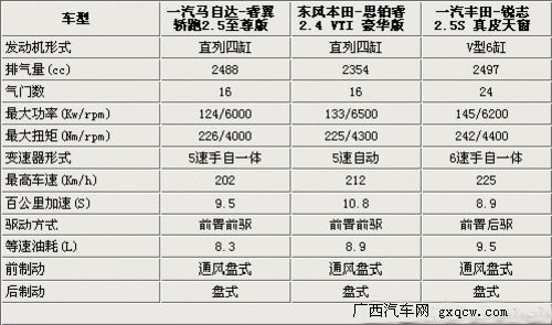 通過以上橫向?qū)Ρ,可以看出睿翼轎跑、思鉑睿和銳志的排量都在2.4這個區(qū)間,并且都具備了日系發(fā)動機(jī)傳統(tǒng)的特點(diǎn):性能良好、油耗經(jīng)濟(jì),但是發(fā)動機(jī)形式卻完全不同。從官方公布的等速油耗來看,睿翼轎跑的油耗要低于本田思鉑睿和豐田銳志,這與一汽馬自達(dá)強(qiáng)調(diào)的輕量化設(shè)計(jì)車身是分不開的。銳志采用了V型6缸發(fā)動機(jī),該發(fā)動機(jī)運(yùn)用了雙VVT-I技術(shù),因此在動力方面明顯要優(yōu)越于睿翼轎跑和思鉑睿,同時再加上銳志為后驅(qū)車型,再加上百公里加速僅為8.9秒,就從這兩點(diǎn)就也可以看出銳志是一款偏運(yùn)動的車型。在變速器方面,銳志略勝一籌,配備了手自一體式6速自動變速箱,思鉑睿則是5速自動變速器,是三款車型中配置較低的。三款車型的制動系統(tǒng)都是前通風(fēng)盤后實(shí)心盤。