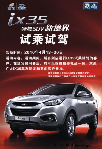 4月13-30日,在鑫廣達(dá)北京現(xiàn)代4S店開展IX35試乘試駕會,活動期間到店參與活動的客戶,在填寫完調(diào)查問卷后,均可以獲得精美禮品一份。