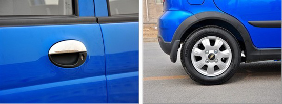 在車身尺寸上,樂馳運(yùn)動(dòng)版的外廓數(shù)據(jù)為3565/1515/1510(mm),軸距為2340mm。除了軸距外,其他方面較普通版來說都有小幅變化,車身的長(zhǎng)度及寬度的變化想來是受車身下部增加的包圍所致。從側(cè)面看,在普通版車型上出現(xiàn)的黑色車身防擦條依然保留,不過配上下部的黑色包圍使樂馳運(yùn)動(dòng)版的側(cè)面看起來還比較立體。另外,樂馳運(yùn)動(dòng)版的門拉手均采用了鍍鉻材質(zhì),看起來更顯質(zhì)感。在輪轂造型上,樂馳運(yùn)動(dòng)版采用的是7輻式設(shè)計(jì),而普通版的車型則采用的是5輻扇葉式造型,在材質(zhì)方面,除了最低配的優(yōu)越型之外,均采用了鋁合金材質(zhì)。