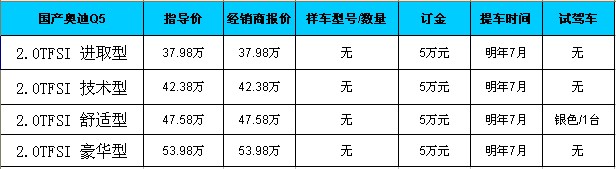 國產(chǎn)奧迪Q5于3月20日正式上市。日前,編輯從廣西鉅榮汽車4S店獲悉,現(xiàn)店內(nèi)有一臺(tái)試乘試駕車,型號(hào)為2.0TFSI舒適型。據(jù)銷售顧問介紹,現(xiàn)在訂車需繳納5萬元訂金,由于車源緊張,需明年7月方可提車。詳情請(qǐng)見下表: