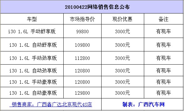 近日,編輯從鑫廣達(dá)北京現(xiàn)代了解到,目前i30、悅動(dòng)均有現(xiàn)車,而i30則全系現(xiàn)金優(yōu)惠3000元,有意出手的朋友,均可到店詳情了解,具體價(jià)格優(yōu)惠請(qǐng)看如下表格: