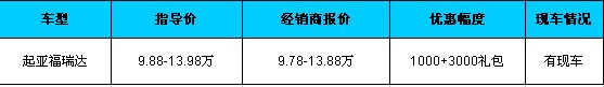 近日,編輯從廣西經(jīng)銷商處獲悉,目前購(gòu)買東風(fēng)悅達(dá)起亞福瑞迪)全系優(yōu)惠1000元現(xiàn)金,再送價(jià)值3000元禮包,店內(nèi)有現(xiàn)車。具體信息見下表: