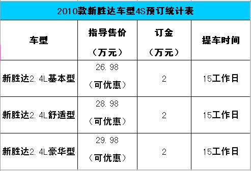 近日,編輯到廣西南現汽車4S店了解到,目前兩臺維拉克斯豪華導航版進駐南寧店,現車銷售價格43.80萬,同時還了解到,2010款新勝達從即日起開始接受預訂,消費者可交20000元誠意金進行排號,屆時價格也會公布,如果對公布的價格不滿意,可以退還訂金。據店內銷售人員介紹,2010款新勝達將有三種型號,排量則是2.4L,與老款的2.7L不同。