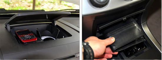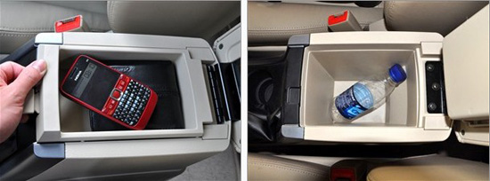 中控臺最上方的儲物盒及空調(diào)下方可容納一個錢夾的儲物盒