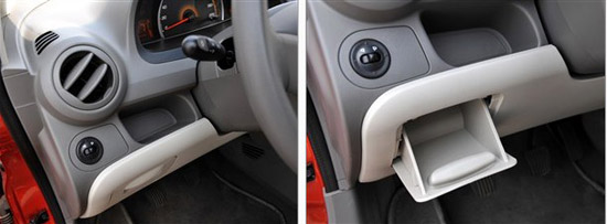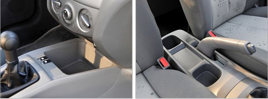 左圖:排擋桿前方的儲物格融了不小;右圖:前排座椅中央的兩個儲物格,前面的適合放置煙灰缸。