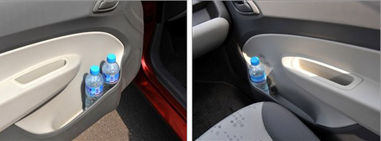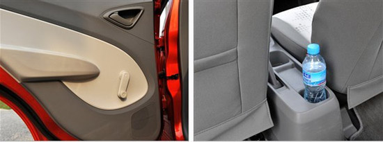 左圖:1.2車型后窗為手搖,門內側沒有儲物空間;右圖:后排只有這一個杯架。