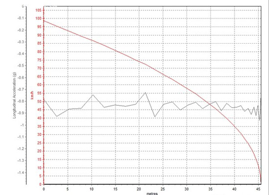 46.41米的平均成績并不理想,圖為制動距離46.47米的制動曲線。