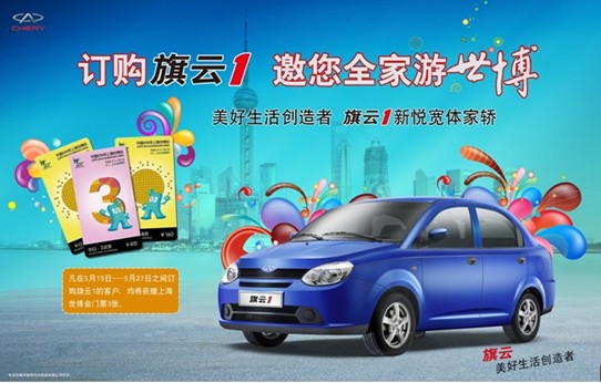 近日,小編從鑫廣達(dá)奇瑞4S店了解到,奇瑞汽車公司旗云1產(chǎn)品即將于5月27日全國上市 ;即日起至27日止將舉辦一個(gè)名為“訂購旗云1 邀您全家游世博”的活動(dòng),凡在活動(dòng)期間訂購旗云1并交付訂金(訂金2000元)的用戶,均可免費(fèi)獲贈(zèng)世博會(huì) 3張門票。