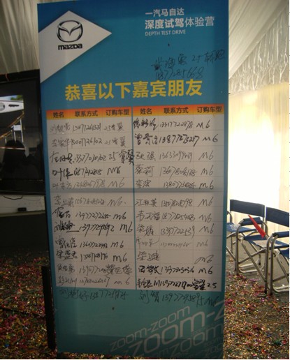 2010年5月16日,雖然烈日當空,但是絲毫沒有減弱車友朋友們對睿翼的滿腔熱情,活動當天仍然有將近150名車友來到活動現(xiàn)場感受睿翼的極限駕控。在中汽聯(lián)專業(yè)車手精彩的演示和一汽馬自達柳州鑫廣達資深講師的專業(yè)的講解下,許多客戶不得不折服于睿翼,現(xiàn)場紛紛下定單,最終,本次活動成交15臺睿翼、24臺馬6 ,以總成績39臺的優(yōu)異成績?yōu)楸敬卧囻{會畫上圓滿的句號。